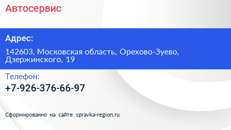Автосервис по адресу 142603, Московская область, Орехово-Зуево, Дзержинского, 19 в дальнейшем Организация, размещена в следующих категориях: