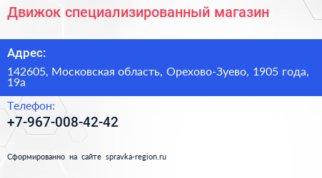 Движок, специализированный магазин по адресу 142605, Московская область, Орехово-Зуево, 1905 года, 19а в дальнейшем Организация, размещена в следующих категориях:
