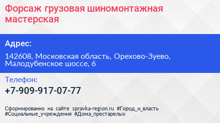 Форсаж, грузовая шиномонтажная мастерская по адресу 142608, Московская область, Орехово-Зуево, Малодубенское шоссе, 6 в дальнейшем Организация, размещена в следующих категориях: