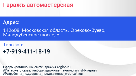 Гаражъ, автомастерская по адресу 142608, Московская область, Орехово-Зуево, Малодубенское шоссе, 6 в дальнейшем Организация, размещена в следующих категориях: