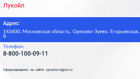 Лукойл по адресу 142600, Московская область, Орехово-Зуево, Егорьевская, 8 в дальнейшем Организация, размещена в следующих категориях: