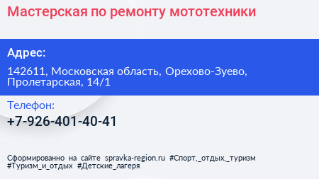 Мастерская по ремонту мототехники по адресу 142611, Московская область, Орехово-Зуево, Пролетарская, 14/1 в дальнейшем Организация, размещена в следующих категориях:
