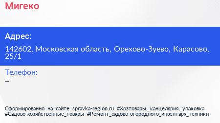 Мигеко по адресу 142602, Московская область, Орехово-Зуево, Карасово, 25/1 в дальнейшем Организация, размещена в следующих категориях: