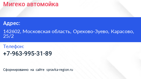 Мигеко, автомойка по адресу 142602, Московская область, Орехово-Зуево, Карасово, 25/2 в дальнейшем Организация, размещена в следующих категориях: