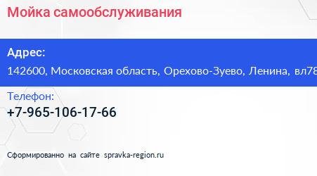 Мойка самообслуживания по адресу 142600, Московская область, Орехово-Зуево, Ленина, вл78 в дальнейшем Организация, размещена в следующих категориях: