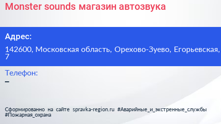Monster sounds, магазин автозвука по адресу 142600, Московская область, Орехово-Зуево, Егорьевская, 7 в дальнейшем Организация, размещена в следующих категориях:
