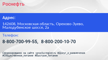 Роснефть по адресу 142608, Московская область, Орехово-Зуево, Малодубенское шоссе, 2а в дальнейшем Организация, размещена в следующих категориях: