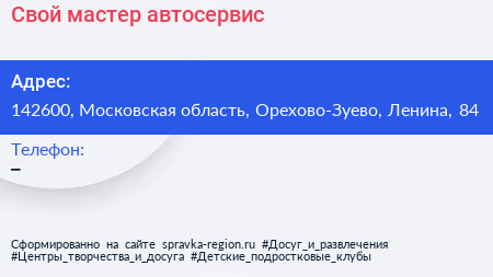 Свой мастер, автосервис по адресу 142600, Московская область, Орехово-Зуево, Ленина, 84 в дальнейшем Организация, размещена в следующих категориях: