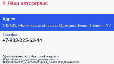 У Лёхи, автосервис по адресу 142601, Московская область, Орехово-Зуево, Ленина, 97 в дальнейшем Организация, размещена в следующих категориях: