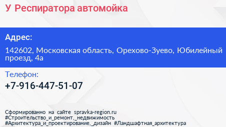 У Респиратора, автомойка по адресу 142602, Московская область, Орехово-Зуево, Юбилейный проезд, 4а в дальнейшем Организация, размещена в следующих категориях:
