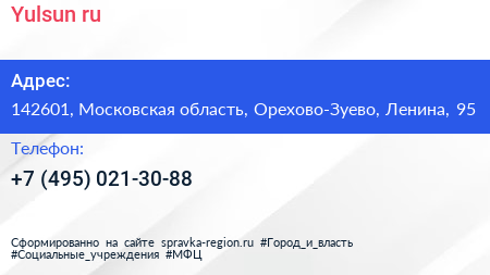 Yulsun.ru по адресу 142601, Московская область, Орехово-Зуево, Ленина, 95 в дальнейшем Организация, размещена в следующих категориях: