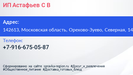 ИП Астафьев С.В. по адресу 142613, Московская область, Орехово-Зуево, Северная, 14 в дальнейшем Организация, размещена в следующих категориях: