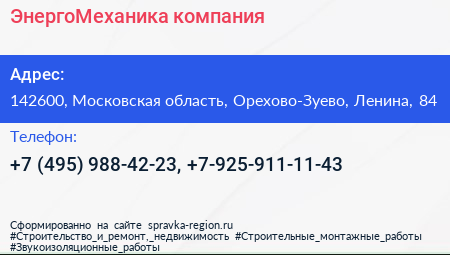 ЭнергоМеханика, компания по адресу 142600, Московская область, Орехово-Зуево, Ленина, 84 в дальнейшем Организация, размещена в следующих категориях: