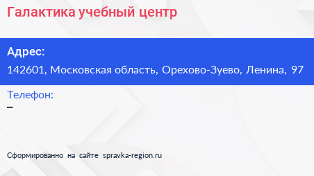 Галактика, учебный центр по адресу 142601, Московская область, Орехово-Зуево, Ленина, 97 в дальнейшем Организация, размещена в следующих категориях: