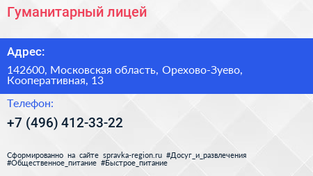 Гуманитарный лицей по адресу 142600, Московская область, Орехово-Зуево, Кооперативная, 13 в дальнейшем Организация, размещена в следующих категориях: