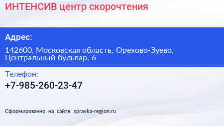 ИНТЕНСИВ, центр скорочтения по адресу 142600, Московская область, Орехово-Зуево, Центральный бульвар, 6 в дальнейшем Организация, размещена в следующих категориях: