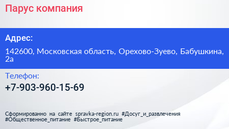 Парус, компания по адресу 142600, Московская область, Орехово-Зуево, Бабушкина, 2а в дальнейшем Организация, размещена в следующих категориях: