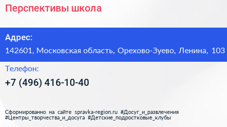 Перспективы, школа по адресу 142601, Московская область, Орехово-Зуево, Ленина, 103 в дальнейшем Организация, размещена в следующих категориях:
