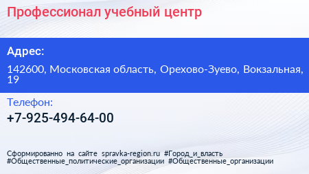 Профессионал, учебный центр по адресу 142600, Московская область, Орехово-Зуево, Вокзальная, 19 в дальнейшем Организация, размещена в следующих категориях: