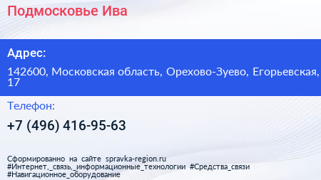 Подмосковье Ива по адресу 142600, Московская область, Орехово-Зуево, Егорьевская, 17 в дальнейшем Организация, размещена в следующих категориях: