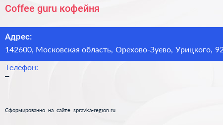 Coffee guru, кофейня по адресу 142600, Московская область, Орехово-Зуево, Урицкого, 92 в дальнейшем Организация, размещена в следующих категориях: