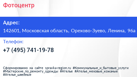 Фотоцентр по адресу 142601, Московская область, Орехово-Зуево, Ленина, 96а в дальнейшем Организация, размещена в следующих категориях: