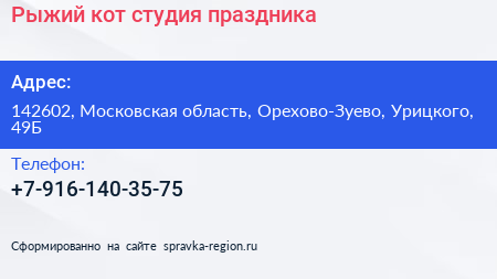 Рыжий кот, студия праздника по адресу 142602, Московская область, Орехово-Зуево, Урицкого, 49Б в дальнейшем Организация, размещена в следующих категориях: