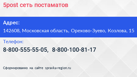 5post, сеть постаматов по адресу 142608, Московская область, Орехово-Зуево, Козлова, 15 в дальнейшем Организация, размещена в следующих категориях: