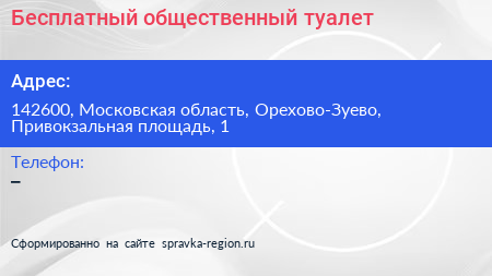 Бесплатный общественный туалет по адресу 142600, Московская область, Орехово-Зуево, Привокзальная площадь, 1 в дальнейшем Организация, размещена в следующих категориях: