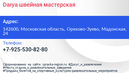Darya, швейная мастерская по адресу 142600, Московская область, Орехово-Зуево, Мадонская, 24 в дальнейшем Организация, размещена в следующих категориях: