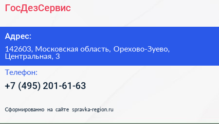 ГосДезСервис по адресу 142603, Московская область, Орехово-Зуево, Центральная, 3 в дальнейшем Организация, размещена в следующих категориях: