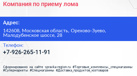 Компания по приему лома по адресу 142608, Московская область, Орехово-Зуево, Малодубенское шоссе, 28 в дальнейшем Организация, размещена в следующих категориях: