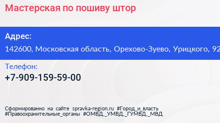 Мастерская по пошиву штор по адресу 142600, Московская область, Орехово-Зуево, Урицкого, 92 в дальнейшем Организация, размещена в следующих категориях: