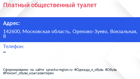 Платный общественный туалет по адресу 142600, Московская область, Орехово-Зуево, Вокзальная, 8 в дальнейшем Организация, размещена в следующих категориях: