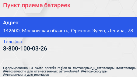 Пункт приема батареек по адресу 142600, Московская область, Орехово-Зуево, Ленина, 78 в дальнейшем Организация, размещена в следующих категориях: