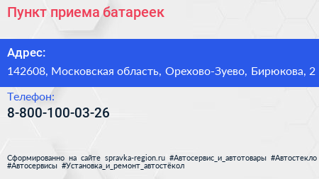 Пункт приема батареек по адресу 142608, Московская область, Орехово-Зуево, Бирюкова, 2 в дальнейшем Организация, размещена в следующих категориях: