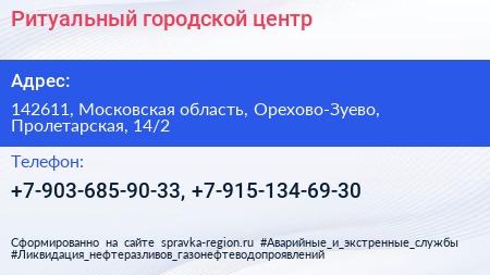 Ритуальный городской центр по адресу 142611, Московская область, Орехово-Зуево, Пролетарская, 14/2 в дальнейшем Организация, размещена в следующих категориях: