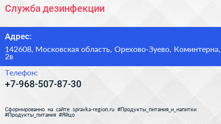 Служба дезинфекции по адресу 142608, Московская область, Орехово-Зуево, Коминтерна, 2в в дальнейшем Организация, размещена в следующих категориях: