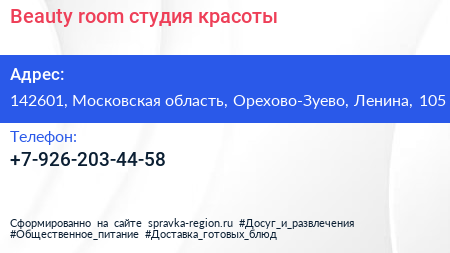 Beauty room, студия красоты по адресу 142601, Московская область, Орехово-Зуево, Ленина, 105 в дальнейшем Организация, размещена в следующих категориях: