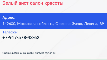 Белый аист, салон красоты по адресу 142600, Московская область, Орехово-Зуево, Ленина, 89 в дальнейшем Организация, размещена в следующих категориях: