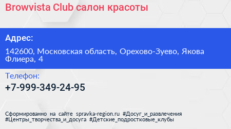 Browvista Club, салон красоты по адресу 142600, Московская область, Орехово-Зуево, Якова Флиера, 4 в дальнейшем Организация, размещена в следующих категориях: