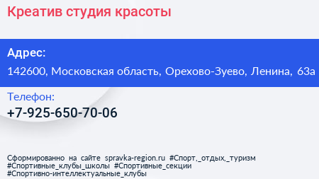 Креатив, студия красоты по адресу 142600, Московская область, Орехово-Зуево, Ленина, 63а в дальнейшем Организация, размещена в следующих категориях:
