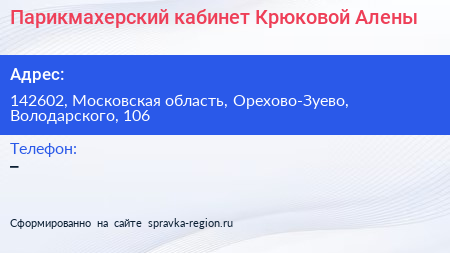 Парикмахерский кабинет Крюковой Алены по адресу 142602, Московская область, Орехово-Зуево, Володарского, 106 в дальнейшем Организация, размещена в следующих категориях: