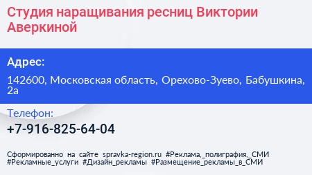 Студия наращивания ресниц Виктории Аверкиной по адресу 142600, Московская область, Орехово-Зуево, Бабушкина, 2а в дальнейшем Организация, размещена в следующих категориях: