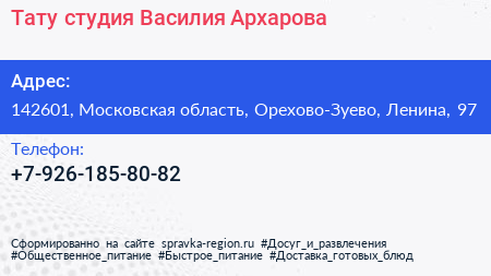Тату-студия Василия Архарова по адресу 142601, Московская область, Орехово-Зуево, Ленина, 97 в дальнейшем Организация, размещена в следующих категориях: