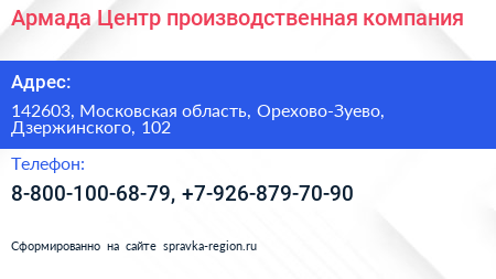 Армада-Центр, производственная компания по адресу 142603, Московская область, Орехово-Зуево, Дзержинского, 102 в дальнейшем Организация, размещена в следующих категориях:
