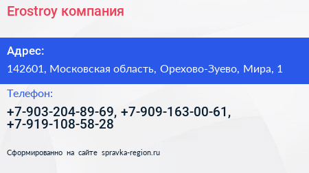 Erostroy, компания по адресу 142601, Московская область, Орехово-Зуево, Мира, 1 в дальнейшем Организация, размещена в следующих категориях: