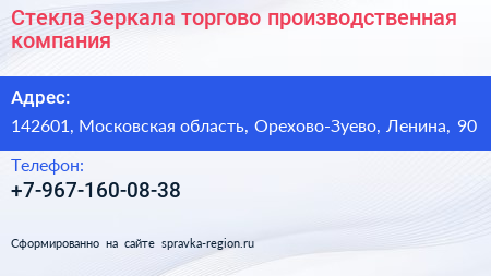 Стекла & Зеркала, торгово-производственная компания по адресу 142601, Московская область, Орехово-Зуево, Ленина, 90 в дальнейшем Организация, размещена в следующих категориях: