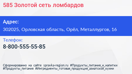 585*Золотой, сеть ломбардов по адресу 302025, Орловская область, Орёл, Металлургов, 16 в дальнейшем Организация, размещена в следующих категориях: