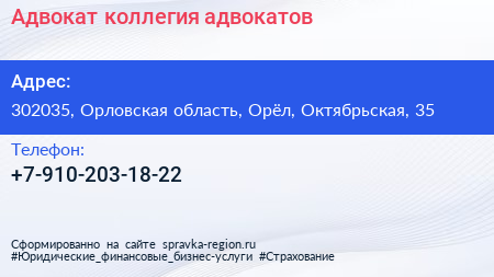 Адвокат, коллегия адвокатов по адресу 302035, Орловская область, Орёл, Октябрьская, 35 в дальнейшем Организация, размещена в следующих категориях: